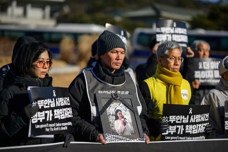Hình: Ông Vũ Văn Sung, ở giữa, cha của Vũ Tú Anh, cầm bức chân dung con gái trong cuộc họp báo trước Phủ Tổng thống ở Seoul, để yêu cầu chính phủ xin lỗi về cuộc truy quét nhập cư dẫn đến cái chết của cô vào ngày 28/10/2025. Ảnh của Shim Hyun-chul, Korea Times. Xem nguồn số 6