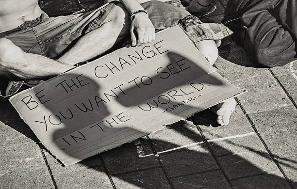 The shadow of a man speaking via megaphone is cast upon a sign quoting Gandhi. Toned black and white image.