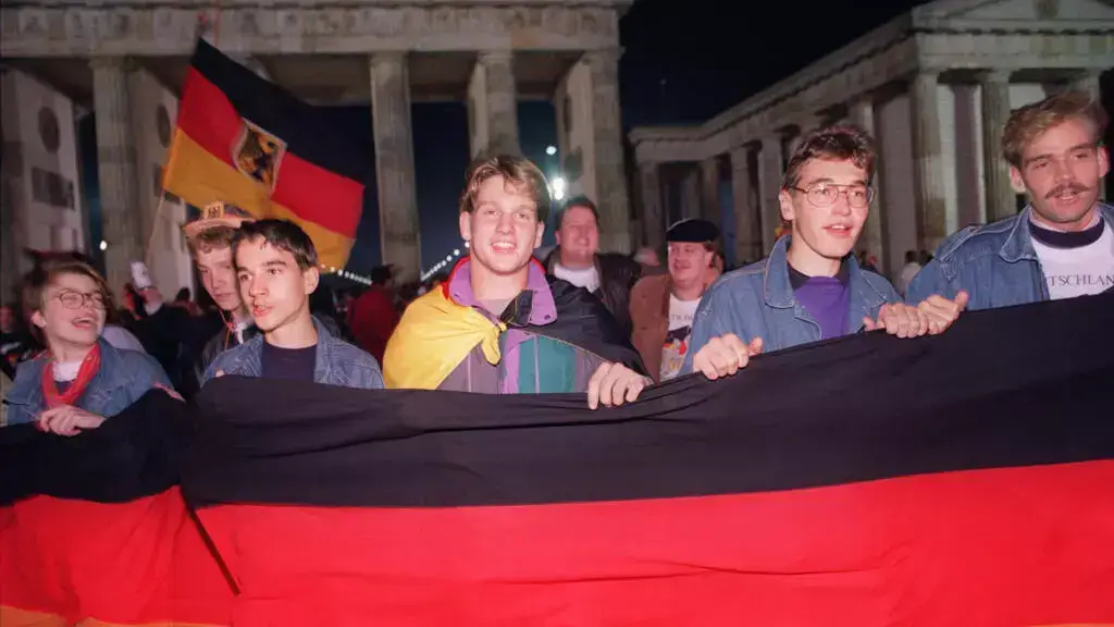 Những người trẻ mừng ngày thống nhất nước Đức trước cổng Brandebourg, Berlin, Đức, ngày 03/10/1990. AFP – GILLES LEIMDORFER